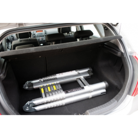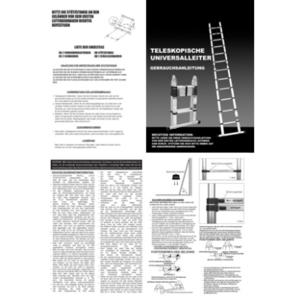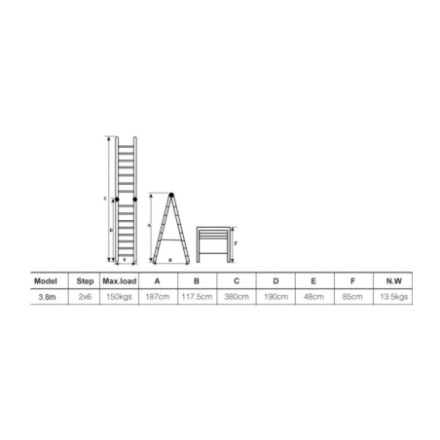 Altezza: 380cm., Altezza in posizione scaletta: 187cm., Gradini: 2x6., Dimensioni chiuso: 89cm x 46cm x 19cm., Peso: 14.4kg.