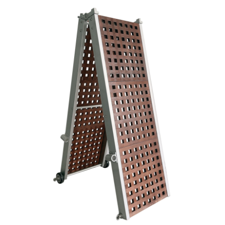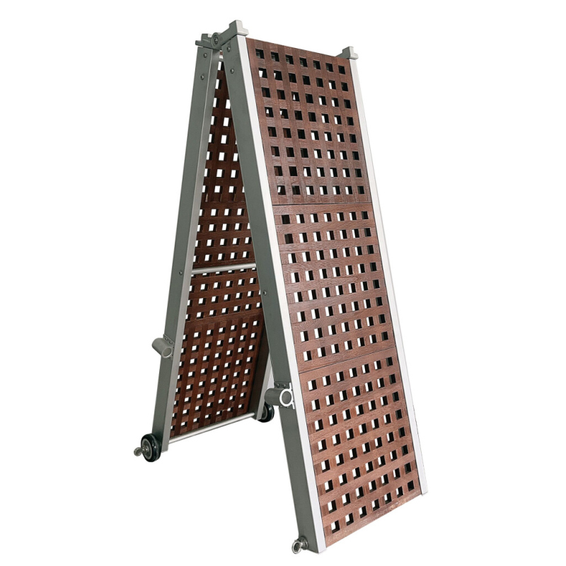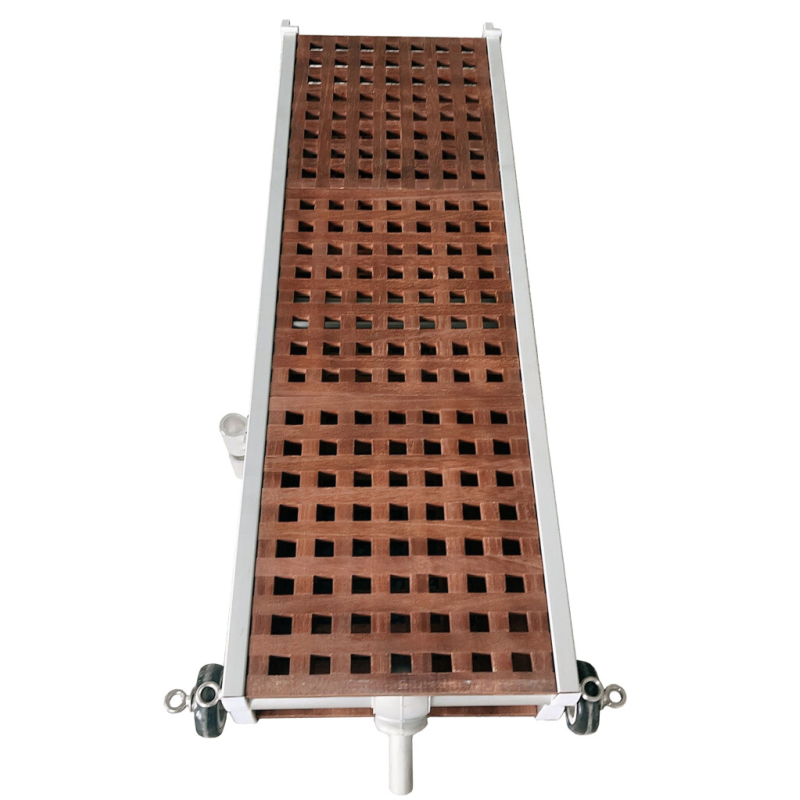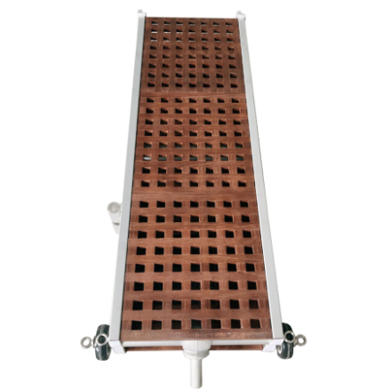La passerella è dotata di ruote, presa di ancoraggio, inoltre gli occhielli alle estremità della passerella consentono il fissaggio della fune del corrimano. (corda/fissaggio e corrimano non sono inclusi) .